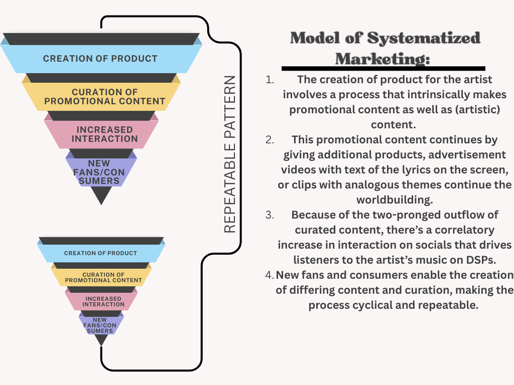 There’s a genesis for everything- Svn4vr has systematized two types of content: pure creation (the music itself) and curation (the worldbuilding around it)- allowing for alluring content that engages with new audiences, while keeping a core fan-base pleasantly surprised and engaged. By creating good music (the VERY first step), the artist creates an initial product that others find useful. The artist, via this specific interaction, garners a population of people that will consume their product before necessitating anything else- promotional content, ads, etc; however, in the curation of the product, the artist allows for a subgroup that is implicitly promotional. Without a keen eye, one would not see any differentiation in the non-promotional and promotional content; so with the coalescence of these two, all of the content being posted treads a line of promotional, necessary worldbuilding. To recapitulate in simple terms, Fallen Media founder says this exact thing would and will continue to happen, with respect to the decline of traditional media outlets, “The other big shift is the line between ads and entertainment starting to disappear. Gen Z, doesn’t want content that pauses to sell them something. They want the ad to be the content and worth watching on its own” (The AvA Connection- Sol Betesh & Rowan Winch). This allows the content itself to act as outreach and leads to increased interaction on socials and the positively correlating nature of the phenomena to streams on DSPs. This inevitably creates a content funnel, and that dumps its new excess of fans into the top of the funnel. This process is detailed vividly below.